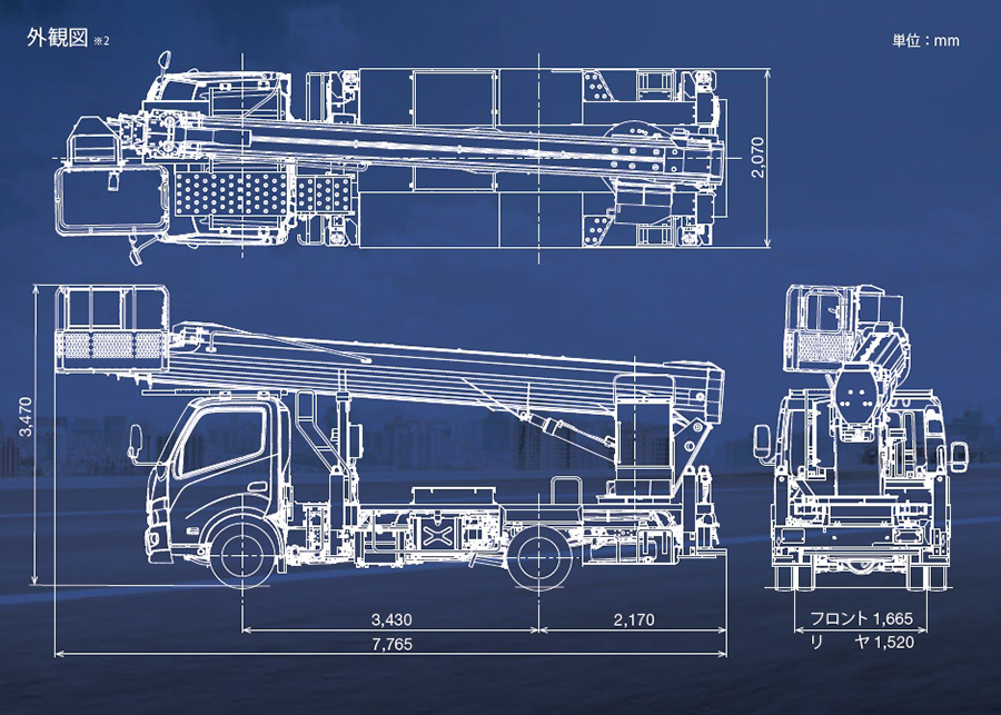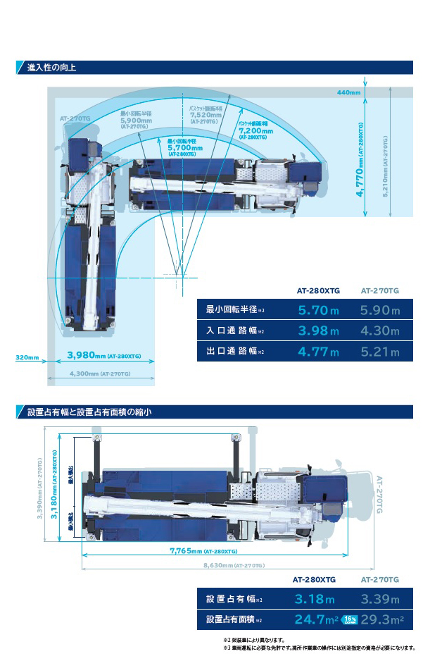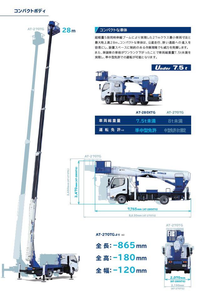車輌総重量7.5t未満を実現し、準中型免許での運転が可能です。(作業する場合は、高所作業車運転技能講習が必要です)従来のAT-270TGと比べ全長-865mm、全高-180mm、全幅-120mmを実現