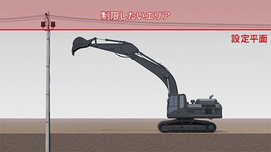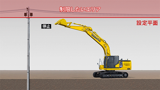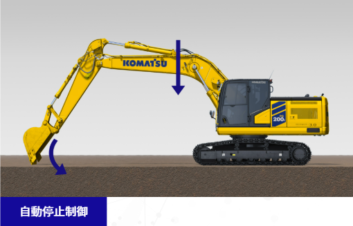 ブームまたはバケットを操作した際に、バケット刃先が設計面に達すると作業機が自動で停止するので、設計面を傷付けません。また、刃先位置合わせも容易です。