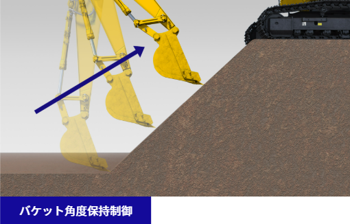 アーム操作した際に、バケットが設計面に沿って動くように自動でブームが上昇。粗掘削作業では設計面を気にすることなく作業が行え、仕上げ作業ではアームレバー操作のみで作業が可能です。さらに、ブーム下げ操作を入れておくことで施工範囲が広がります。